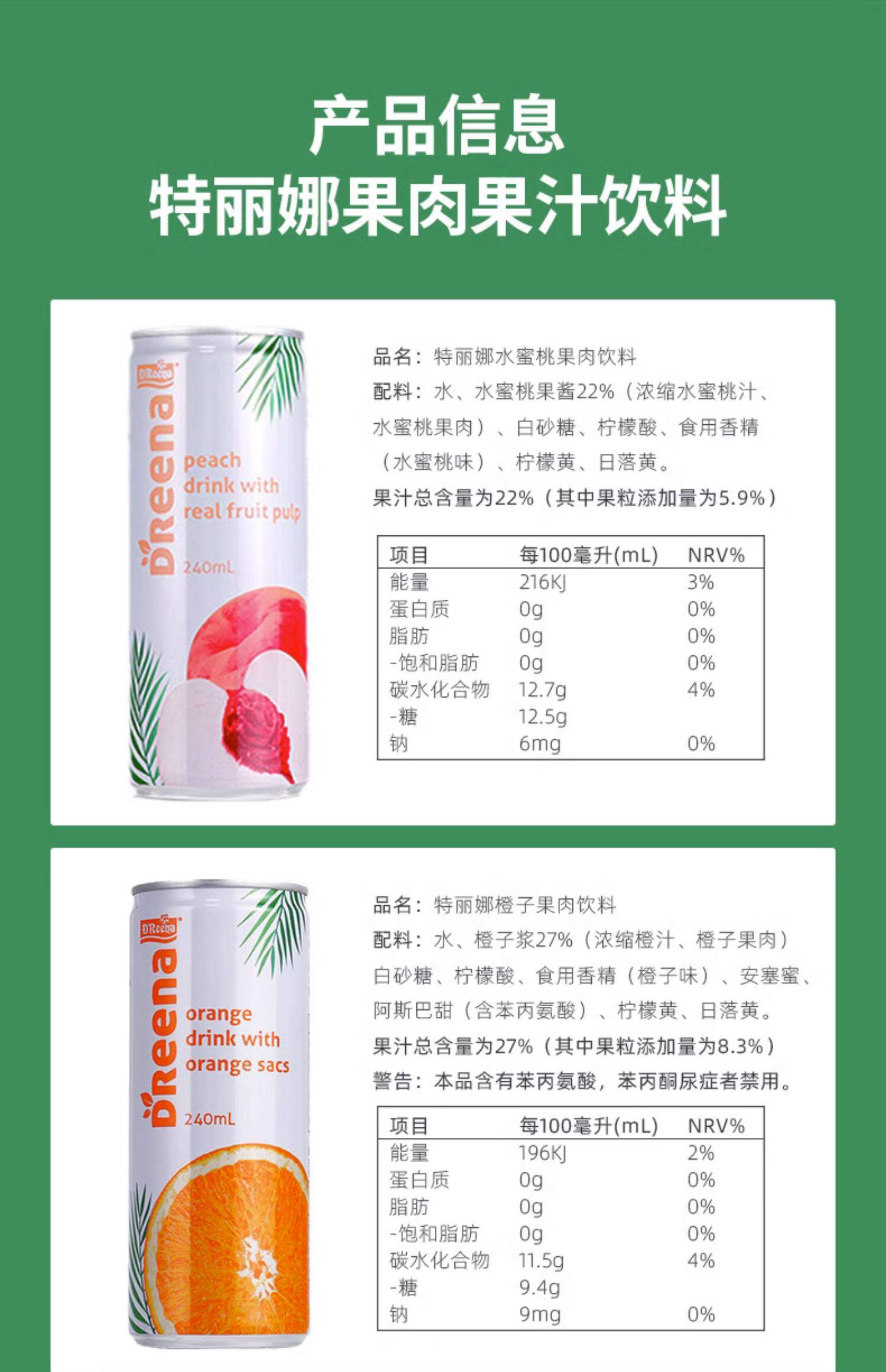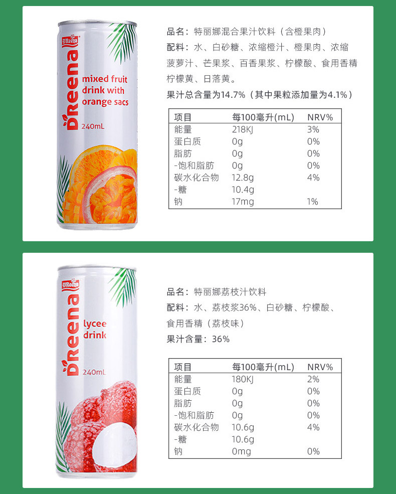 进口特丽娜低脂0脂果肉果汁240ml 夏日饮料饮品